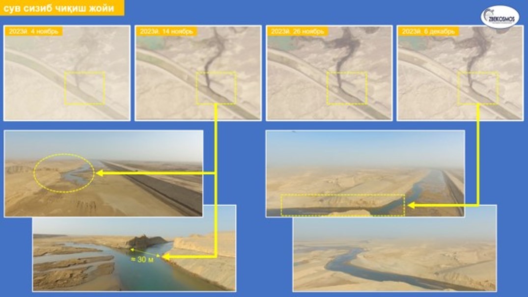 Kosmik monitoring natijasida 2023-yil 4-noyabr kuni Qo’sh-Tepa kanalining 75,6-km da o‘ng qirg‘oqning 30 m ga yaqin qismidan suv sizib chiqishi aniqlangan. 5-noyabr kuni suv tarqalgan hududning maydoni 19,5 km2, 25-noyabrda – 23,8 km2, 13-dekabr holatiga esa 30,3 km2 ni tashkil etib, suvni to‘xtatish choralari ko‘rilmagan.