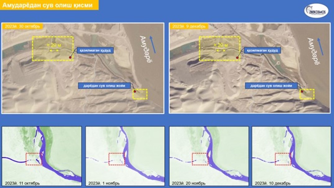 Qo’sh-Tepa kanali qurilishi dinamikasining kosmik monitoringi inshootning Amudaryodan suv olish qismida qazish ishlari yakunlanmaganligi, daryoga ulanish joyida hozirda 20 m ga yaqin qazilmagan hududning mavjudligini ko‘rsatmoqda.